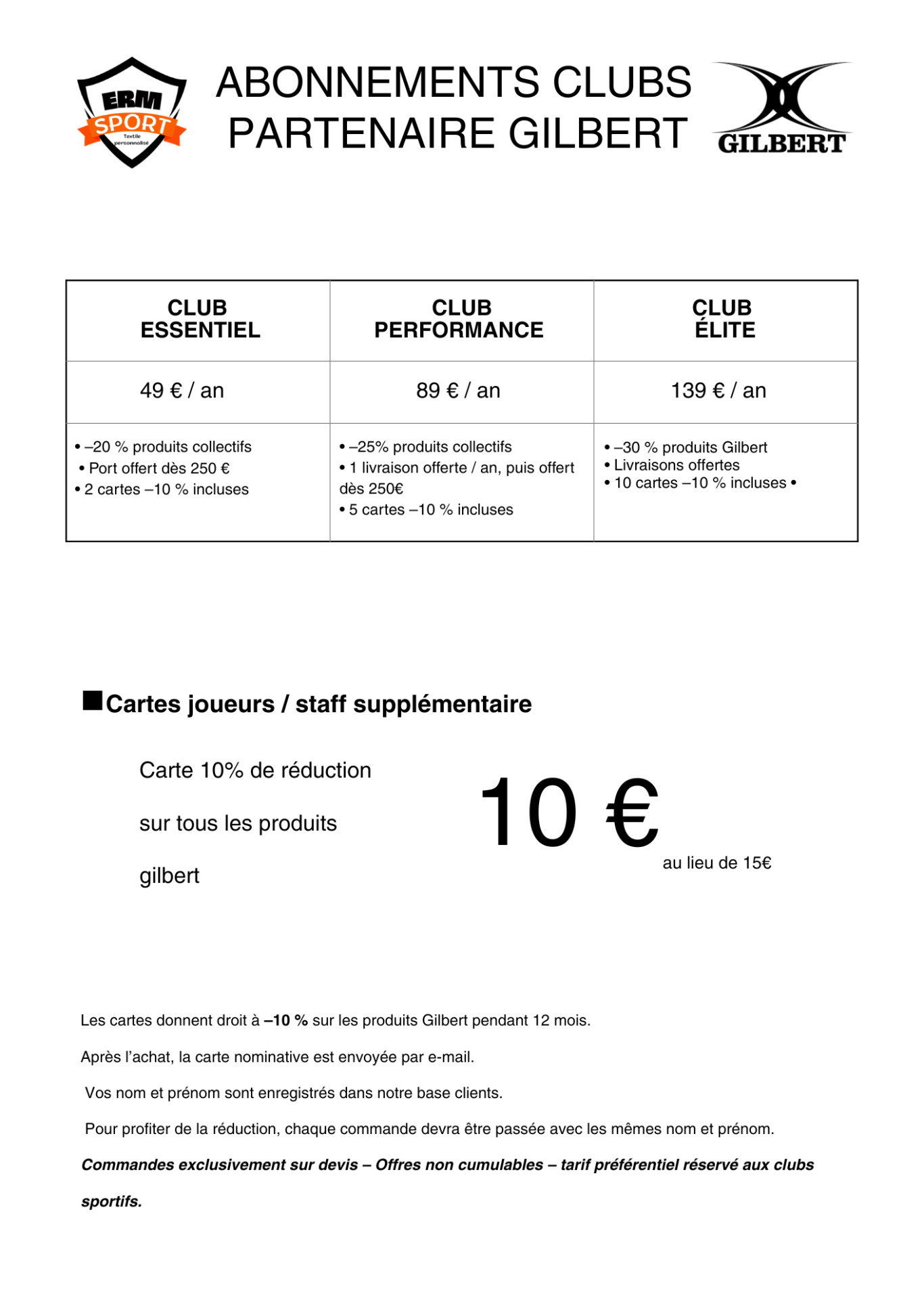 Joueurs, joueuses, arbitres, bénévoles ou simplement fan de rugby, optez pour la carte de réductions à 15€ vous permettant de bénéficiez de 10% de réduction, toutes l'année, sur tous les produits Gilbert.